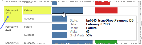 In the example below, of all visits with a database state of bp0645_IssueDirectPayment_DB for data time-stamped February 7 2023, 37% had a result of Failure. Compare the bar length of this calculated metric to other bars with the same result (in this case Failure) to draw conclusions about how this metric trends over time.