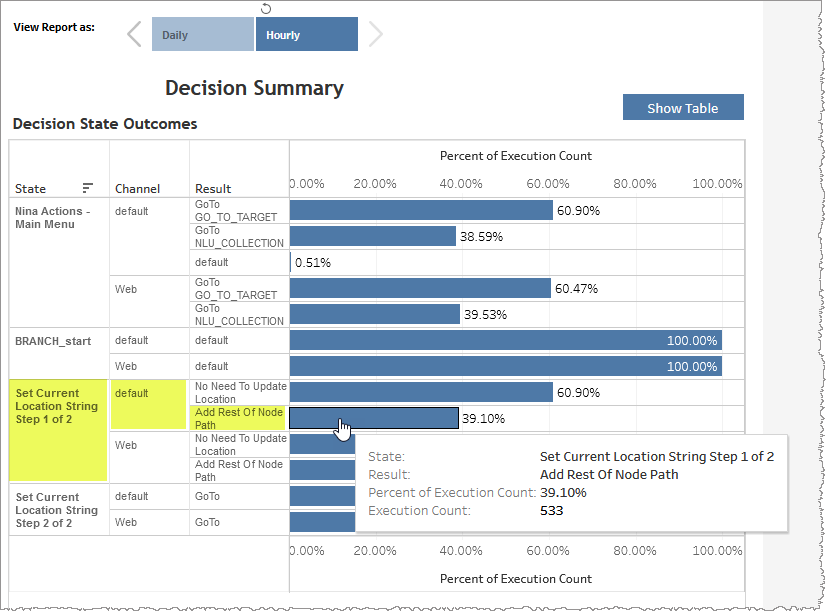 In the example below, there were 533 executions having a result of Add Rest Of Node Path in the default channel and having a decision state of Set Current Location String Step 1 of 2. This count represents 39.10% of all executions regardless of result within this channel and having this decision state.